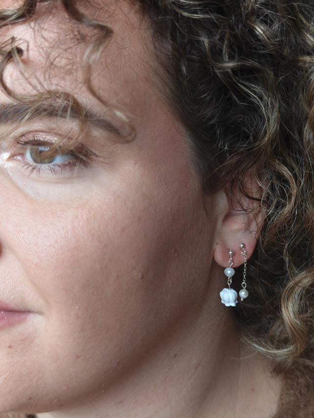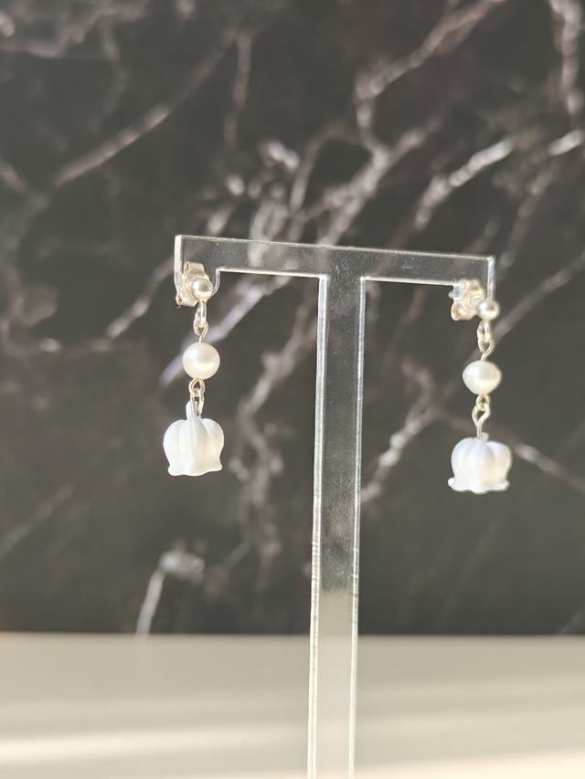 Délicates boucles d'oreilles composées d'un muguet et d'une perle d'eau douce.