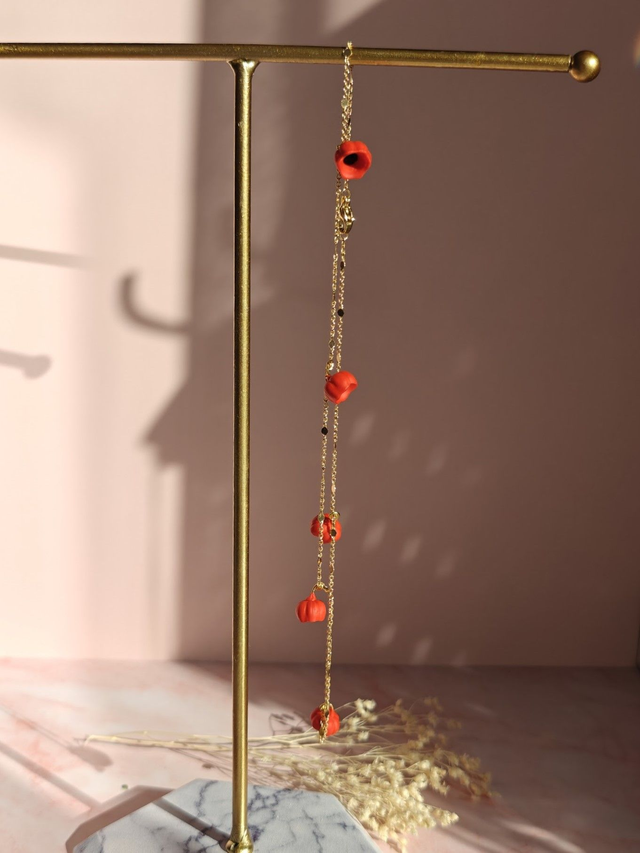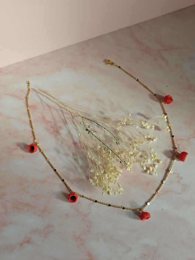 Des petits coquelicots ornent tout le tour de ce joli collier en ras de cou, qui est composé de 5 coquelicots montés sur une chaîne fantaisie ronds plats plaquée or 18 carats.