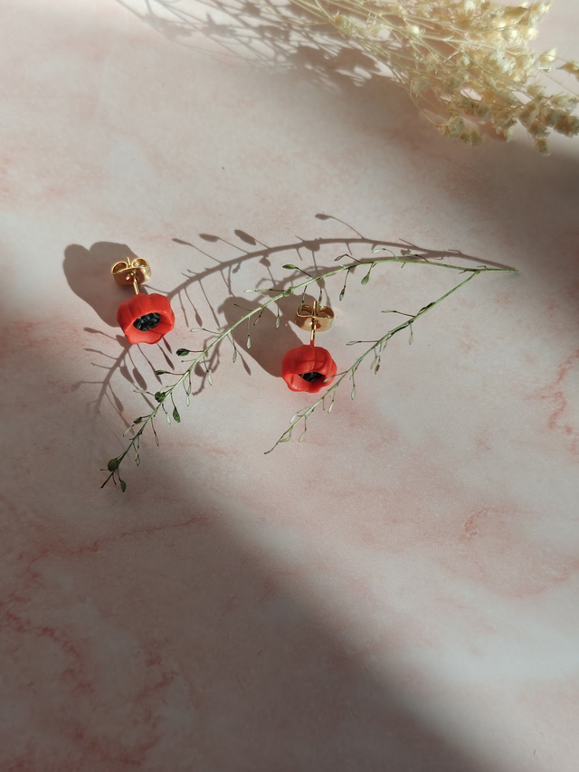 Discrets et romantiques, les puces Aurora sont composées d'un unique coquelicot rouge, noir à l'intérieur, façonné autour d'un clou plaqué or 18 carats.